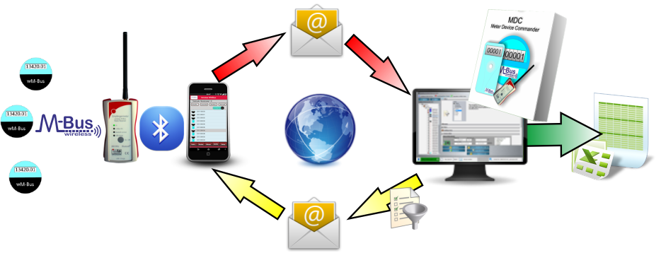 Bluetooth/wM-Bus- oder USB-Empfänger aus unserem Haus zusammen. Die App läuft auf fast allen Handys und Tablets. Das Mobile muss die Fähigkeit des Bluetooth-Empfangs besitzen oder für den USB-Empfänger OTG-fähig sein. Mit Hilfe des Meter Device Commanders wird die Ausleseroute erstellt und dann zum Beispiel per E-mail zum Ausleser auf sein Smartphone gesendet. Das Routenfile wird im App eingelesen.